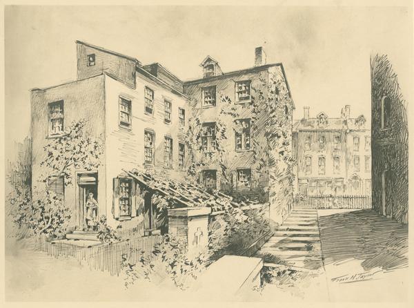Shows a back view of the Wistar and Cadwalader mansions where a garden of Wistaria grows.