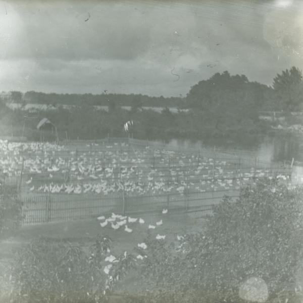 Depicts ducks in a large pen, surrounded by a green field and trees. Dwellings are visible at the top of a hill in the distance