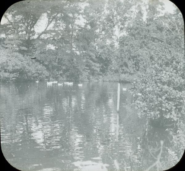 Depicts ducks in a large pen, surrounded by a green field and trees. Dwellings are visible at the top of a hill in the distance