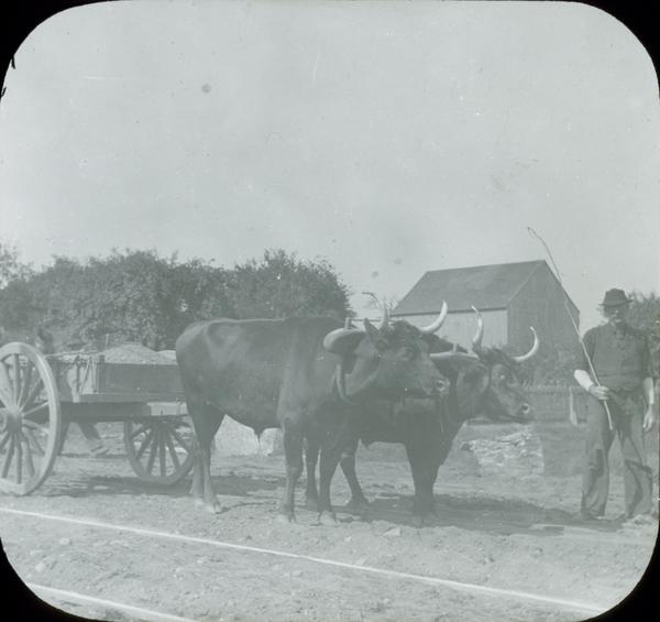 Depicts a man standing in front of two oxen pulling a cart. An unidentified barn structure sits in the distance.