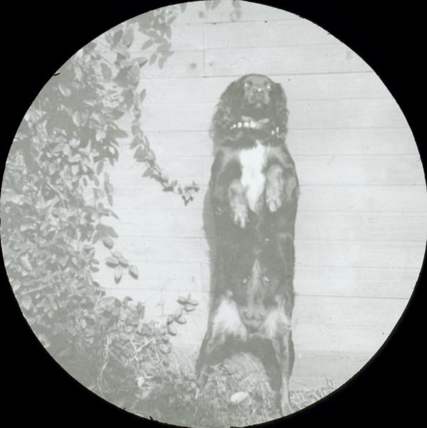 Depicts various poses of the Doering family dog, taken in the backyard of the family home. Includes the dog sitting, standing,