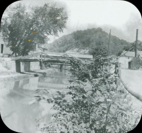 [View of wooden pedestrian bridge spanning a small canal.] [graphic].