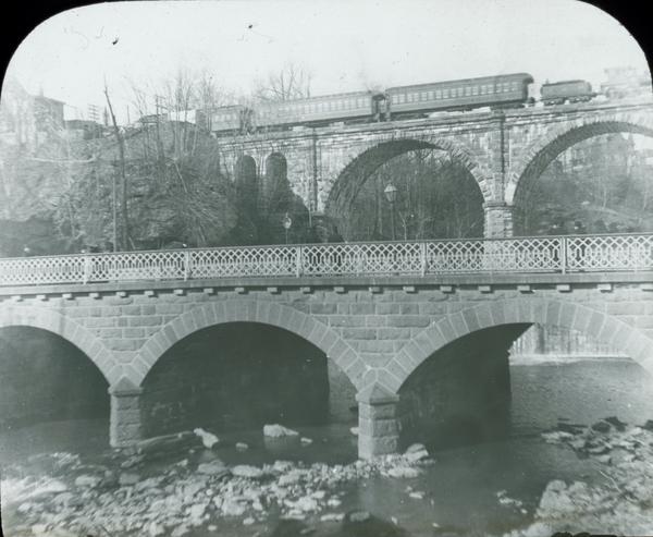 View of the Ridge Avenue Bridge, built in 1888 near the junction of the Wissahickon Creek and the Schuylkill River. A train is crossing the larger Philadelphia & Reading Railroad bridge in the background. Construction of the bridge (also known as the Wissahickon Creek Viaduct or High Stone Bridge) was begun in 1874 by the Philadelphia and Reading Railroad. Due to budgetary constraints, construction was halted and later completed from 1881-1882.