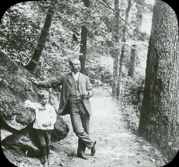 Depicts the photographer's son, Karl Doering, as a boy, leaning against a boulder near an unidentified man on a path in the Wissahickon section of Fairmount Park.