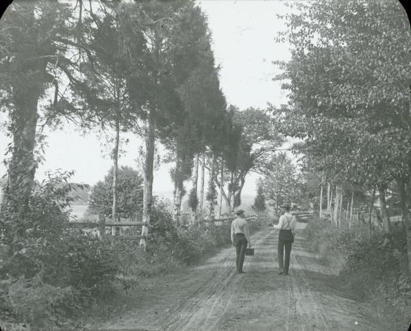 Depicts the backs of two men walking along a dirt path flanked by trees near Wissahickon Creek.