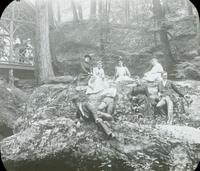 Depicts young men and women from a Sunday school group from Zion or Oxford Presbyterian Church sitting on rocks near a thatch-roof