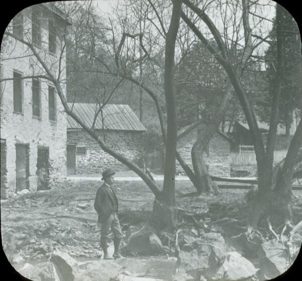 Profile view of an unidentified man standing amidst rocks and trees near dilapidated stone outbuildings on Livezey Lane.