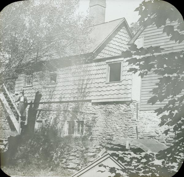 View of an old mill building covered in shingles with a stone foundation. Catharine Rupp Doering, wife of the photographer, stands on a steep wooden staircase (left), opposite an old wooden water wheel (right).