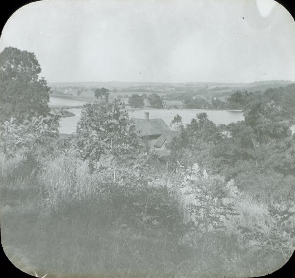 Depicts the curve of the Delaware River with cliffs in the distance. Includes the top of a house near the river, obscured by surrounding trees.