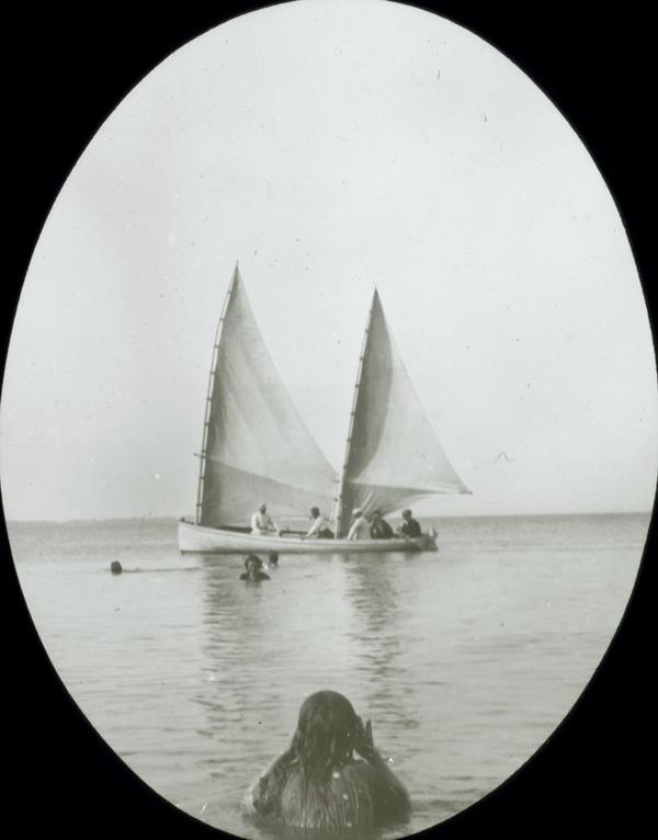 Depicts bathers swimming near a log canoe with two sails carrying at least five people in the Chesapeake Bay. A woman stands in the foreground with her back to the camera, facing the canoe in the distance.