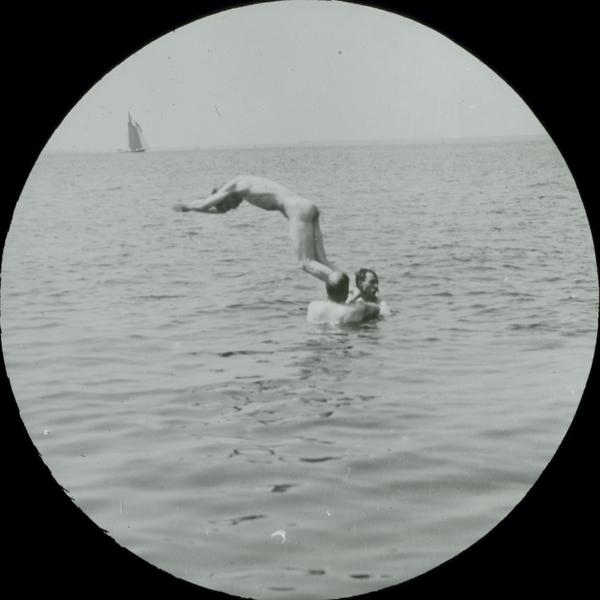 pictures in shallow water. One bather dives into the water from the shoulders of two men. Depicts sailboats in the far distance.