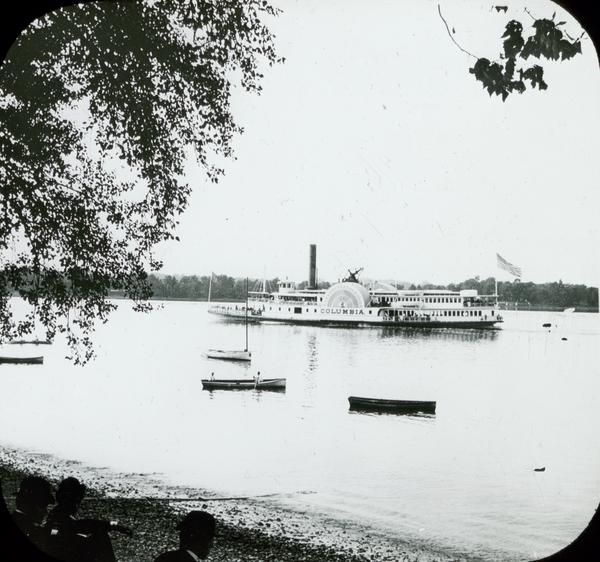 The steamboat Columbia overshadows several small rowboats on the Delaware River. Men sit on the bank of the river watching the steamboat pass by.