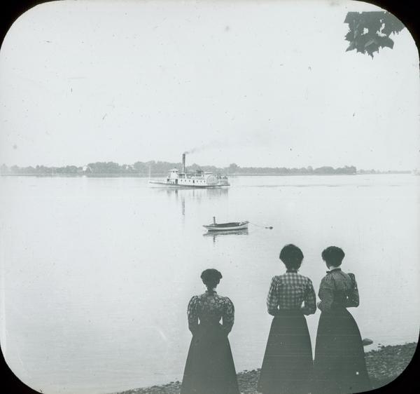 Depicts an unidentified steamboat on the Delaware River near Beverly N.J. In the foreground three women stand with their backs to the camera, looking toward the boat on the river. A small rowboat floats near the bank of the river.