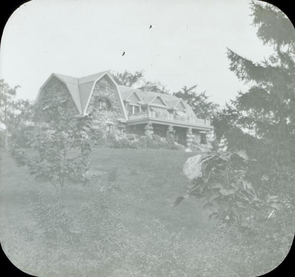Distant view of heavily rusticated stone residence with intersecting gambrel roofs, owned by friends of the Doering family.