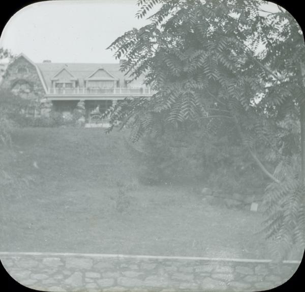 Distant view of front of heavily rusticated stone residence with intersecting gambrel roofs, owned by friends of the Doering family. A low stone wall marks the beginning of a hill in the foreground. At the top of the hill sits a man in a carriage in front of the house. Trees in the foreground hide part of the residence.