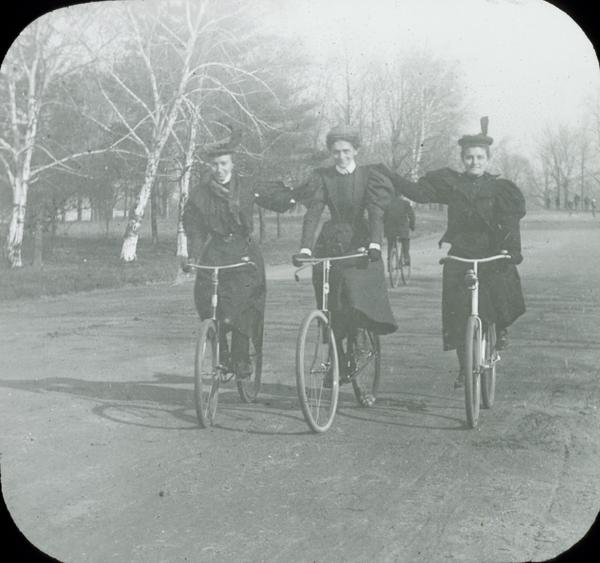 Depicts three women bicycling side by side on a paved road in West Fairmount Park. Mrs. Lindsay (right) and another unidentifed woman rest their hands on the shoulder of Catharine Rupp Doering (wife of the photographer), who is riding in the middle.
