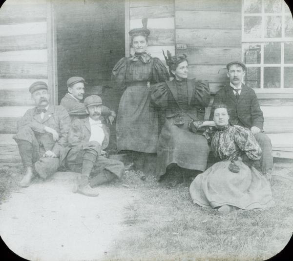 Depicts three women, including Mrs. Lindsay and Catharine Rupp Doering (wife of the photographer), and four men sitting near the entrance of the log outbuilding near the Potts residence, built 1758-1777 by Isaac Potts. Later served as George Washington's headquarters.