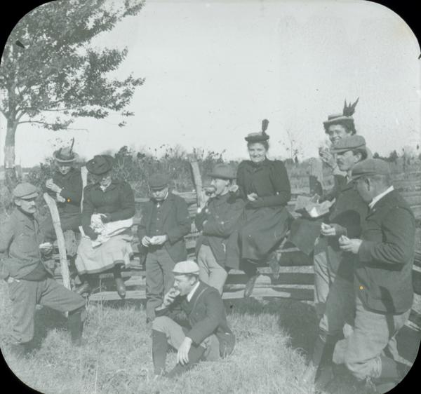 Depicts four women and six men gathered near a wooden fence, eating sandwiches. Includes Al Lindsay (left), Mrs. Schwarts (second from left), Mrs. Lindsay (center) and Catharine Rupp Doering (right). Rest unidentified.