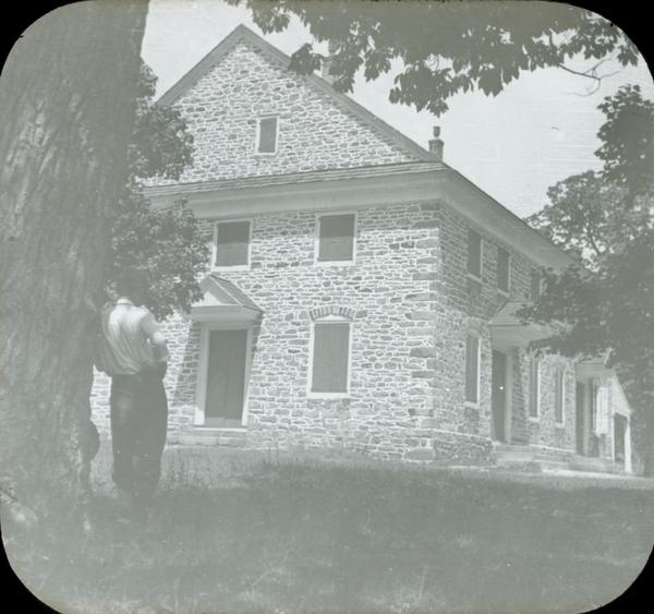 View showing the exterior of the meeting house. Also shows the back of a man leaning against a tree in the foreground.