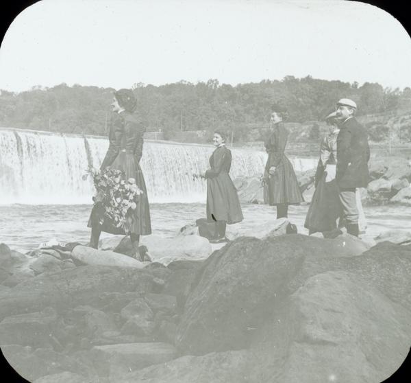 Depicts Catharine Rupp Doering (wife of the photographer) standing on a large rock in the foreground, holding dogwood branches and looking toward the falls of Flat Rock Dam. Mrs Lindsay, Mrs Schwarts (photographer's sister) and Al Schwarts stand nearby.