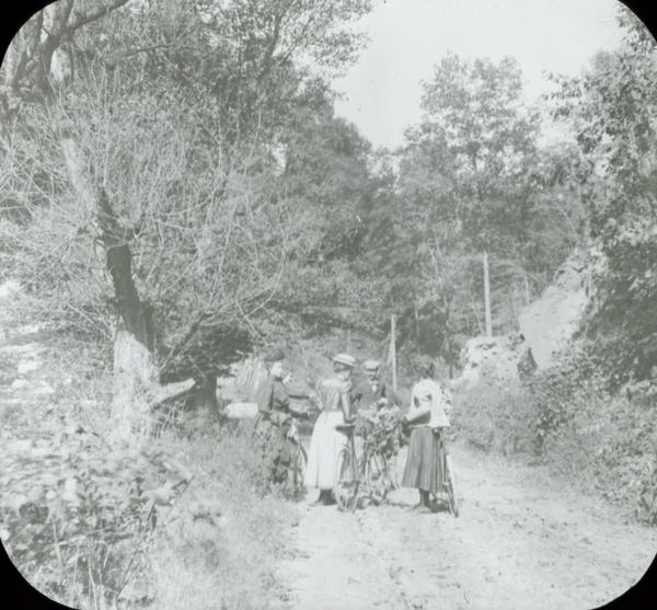 Depicts three women and a man with their bicycles, gathering branches near the side of a dirt road.