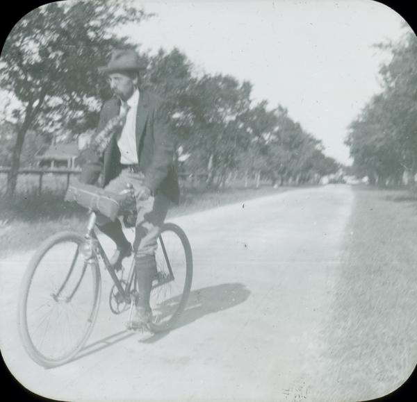 Depicts William Doering (photographer) bicycling along a wide path flanked by large trees.