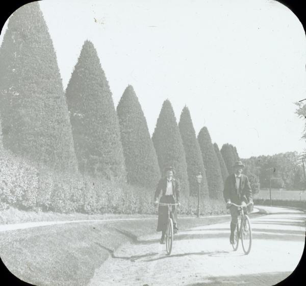 Depicts William Doering, photographer, and wife, Catharine Rupp Doering, bicycling along a path near tall pointed hedges.