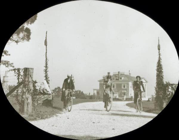 Depicts two women and a man, one of them probably Catharine Rupp Doering, bicycling along an entrance drive, away from the large dwelling in the background.