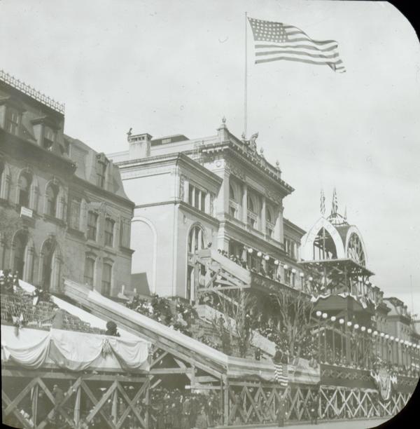 Depicts people sitting and standing underneath of the wooden viewing stands erected along Broad Street for the Peace Jubilee, a celebration of the end of the Spanish American War held in 1898. Included a military parade that passed through a Court of Honor and Triumphal Arch, along with other festivities that lasted several days in October. The word "Victory" is painted on the sides of a wooden tower that rises from the section of the stands in front of the Mercantile Club, built on North Broad Street in 1892 after designs by Baker & Dallett. Patriotic bunting and American flags decorate the stands and surrounding buildings.