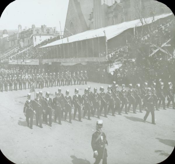 Depicts the Knights of Templar marching in uniform in front of a large crowd standing on the sidewalk and sitting in elevated viewing stands in front of Keneseth Israel Temple. The Knights of Templar was formed as a monastic military group at the end of the First Crusade. Military and naval parades were held during the Peace Jubilee, a celebration of the end of the Spanish American War of 1898.