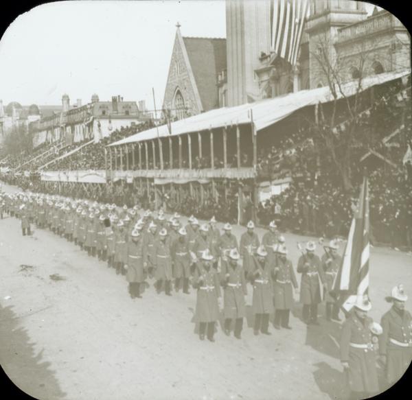 [Peace Jubilee parade, Fire Deparment marching in front of Keneseth Israel Temple, 1717 North Broad Street, Philadelphia.] [graphic].