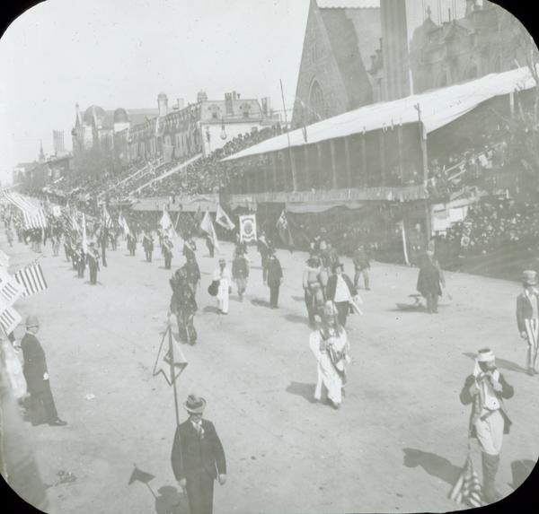 Depicts people dressed in costumes marching in front of a large crowd standing on the sidewalk and sitting in elevated viewing stands in front of Keneseth Israel Temple. The Peace Jubilee celebrated the end of the Spanish American War, with military and naval parades that passed through a Court of Honor and Triumphal Arch.