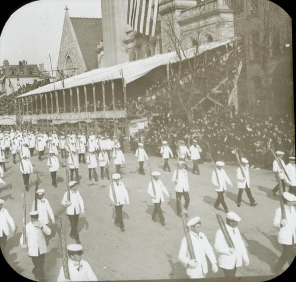 Depicts Freihofer's Bakers wearing white suit jackets and gloves, marching in front of a large crowd standing on the sidewalk and sitting in elevated viewing stands in front of Keneseth Israel Temple. The Peace Jubilee celebrated the end of the Spanish American War, with military and naval parades that passed through a Court of Honor and Triumphal Arch.