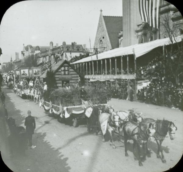 Depicts a log cabin on a float pulled by six white horses wearing Freihofer's Bakery signs. Behind the log cabin is the float carrying four large portraits framed by loaves of bread, also a Freihofer's Bakey float. Includes a large crowd standing on the sidewalk and sitting in the viewing stands in front of Keneseth Israel Temple. Military and naval parades were held during the Peace Jubilee, a celebration of the end of the Spanish American War of 1898.