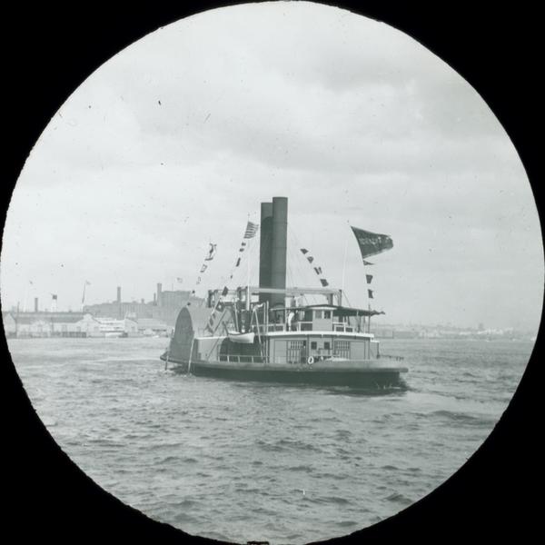 Flags and banners decorate an ice boat on the Delaware River on Naval Day, one of many festivities held during the Peace Jubilee to celebrate the end of the Spanish American War of 1898. Wharves and factory buildings are visible in the background.