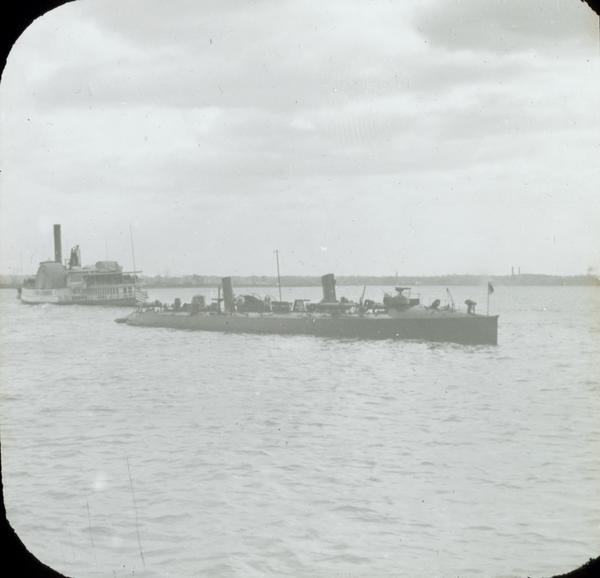 Depicts the torpedo boat on the Delaware River on Naval Day, one of many ships in the naval parade that opened the Peace Jubilee celebration of the end of the Spanish American War of 1898. The U.S.S. Winslow was built in Baltimore, commissioned in December of 1897 and damaged in Cardenas on May 11, 1898. A steamboat closely follows the torpedo boat.