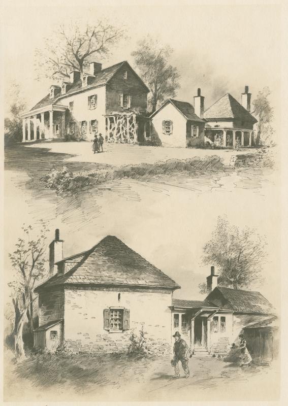Two-part composition of the oldest buildings in Delaware, just over the state line. The top part of the image shows the homestead of Col. Thomas Robinson, while the lower part shows a Swedish block-house built in 1654.