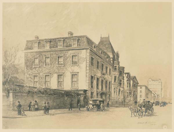 View of a large four-story home with a walled-in garden on a busy street. Pedestrians are on the sidewalk, and early automobiles