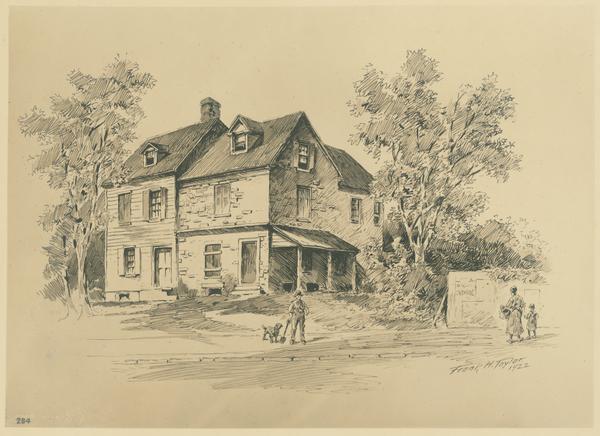 Depicts a wood and stone farm house. Pedestrians in the foreground read a sign posted in front of the building. |