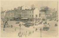 View of a busty intersection filled with people, early automobiles, horse-drawn carriages, and a trolley. The streets are