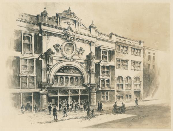 View of the Bijou Theatre. The building has an ornate facade and a sign saying, "B.F. Keith's Bijou Theatre."