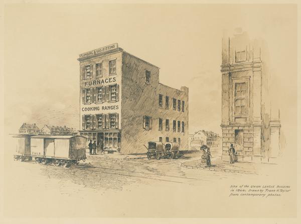 Round about this structure, lined up boldly beside the solemn old home of the Academy of Natural Sciences, soldiery camped, barracked and drilled in Civil War days. Broad street, in front, was but little more than a cobble strewn freight yard where, also, market wagons were parked at nightfall. Then, in 1864, the Union League cleared the ground for its new building, which was completed and occupied in may, 1865, just in time to fittingly celebrate the triumphant close of the great war which led to the formation, in 1863, of this patriotic body of citizens.