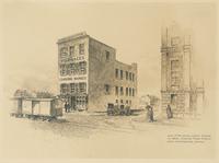 View of a building on a cobblestone street corner. The building has signs that read, "Plumbing & Gas Fitting, Furnaces, Cooking Ranges," and frieght train cars wait on the track in the foreground.