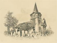 Depicts a church surrounded by a graveyard. Two people stand at the entrance. |