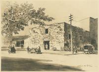 Depicts a low, square building covered in ivy. Early automobiles are parked in front of the structure. |