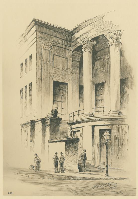 Shows a corner of a classical-style bank with pedestrains standing outside. |