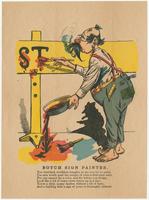 Text: You wretched, worthless bungler, to see you try to paint, / I'm sure would spoil the temper of even a first-class saint, / For you cannot lay a color, and the letters you design, / Look like a lot of scare-crows drawn up in a line ; / You're a dirty, mussy dauber, without a bit of taste, / And a building with a sign of yours is thoroughly defaced.
