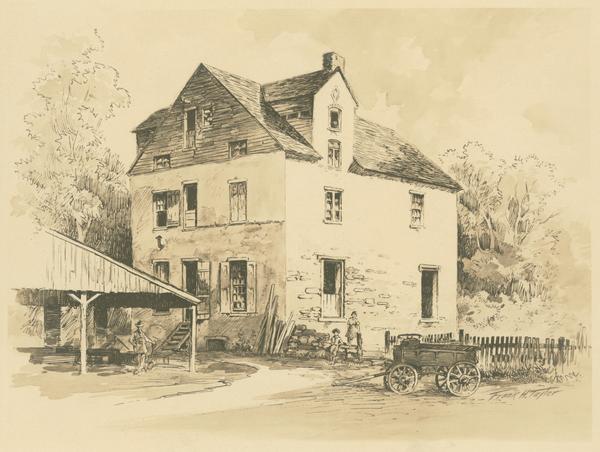 Depicts a stone mill and outbuilding. A wagon rests in the foreground and two children and a man stand in front of the buildings.