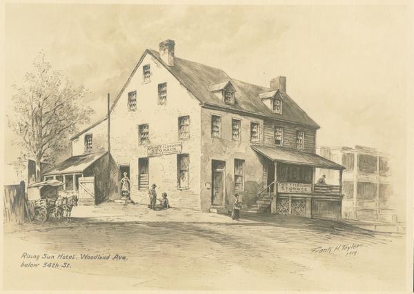 Just southwestward of the old Darby Road toll-gate at Forty-ninth Street there yet remain two time-worn structures once popular with speeders on their way to or returning from Suffolk Driving Park. The first, known as the "Sorrel Horse," is at Greenway lane, just beyond Fifty-first Street. It bears the date of 1800. Some owner, in the time of its decadence, has removed its dormed roof and built above the old walls a third floor as a place of the storage of odds and ends of many sorts. The other, famed as the "Rising Sun," probably dates from colonial days. Not since the ears when "two-forty on the plank road" was the nation-wide synonym of speed records have these old-timers known the prosperity of crowded stable yards and equally crowded tap rooms. They linger as reminders of days and ways long gone of interest chiefly to the passing artist and the oldest inhabitant.
