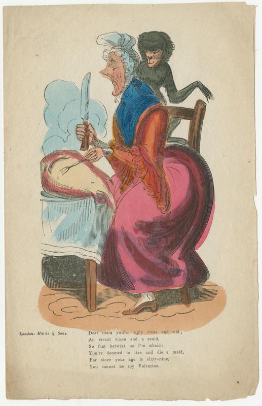 Text: Dear mam you’re ugly cross and old, / An errant vixen and a scold, / So that betwixt us I’m afraid: / You’re doomed to live and die a maid, / For since your age is sixty-nine, / You cannot be my Valentine.